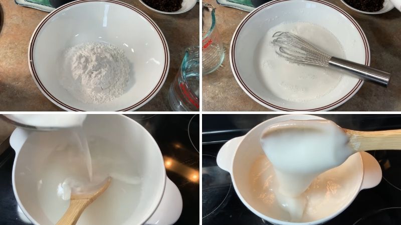 Cho 2 chén nước sôi vào nồi và bật lửa cho nước sôi liên tục. Tiếp đến, bạn cho từ từ phần bột đã pha vào nồi, vừa cho vừa khuấy để bột tan đều. Khi cho hết bột vào, bạn khuấy đến khi bột dẻo lại, khi nhấc lên có thể chảy nhẹ xuống từ từ là được.