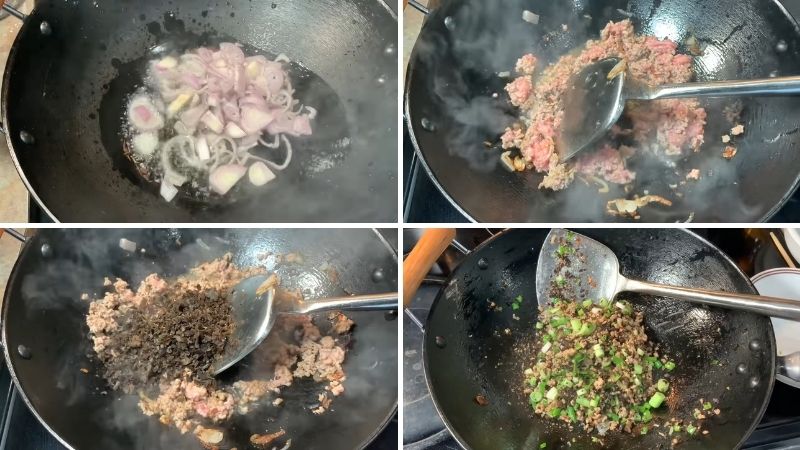 ào, đảo đều cho thịt chín thì cho nấm mèo băm nhuyễn vào xào. Nêm 1/4 muỗng cà phê tiêu, 1/4 muỗng cà phê muối, hành lá băm nhuyễn cho vừa ăn thì tắt bếp.