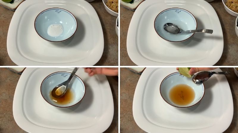 Cho vào chén 1 muỗng canh đường, 3 muỗng canh nước lọc và khuấy cho tan đều. Cho tiếp 1 muỗng canh nước mắm, vắt vào khoảng 1/2 muỗng canh nước cốt chanh (hoặc nước giấm gạo). Nếu ăn cay bạn có thể cắt thêm ớt vào.