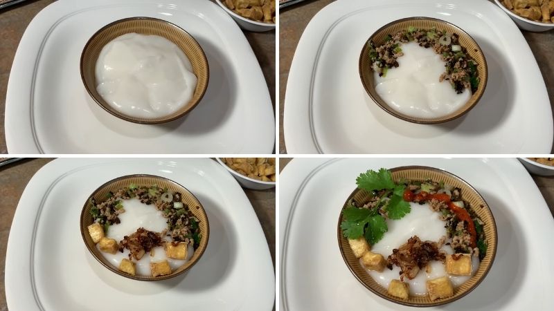 Bánh đúc múc ra tô, bỏ đều lên phần nhân thịt và nấm mèo xào cùng đậu hủ chiên giòn nóng hổi, rưới lên phần nước mắm đậm đà, ít hành phi và tương ớt là có thay chén bánh đúc nóng dẻo thơm rồi.
