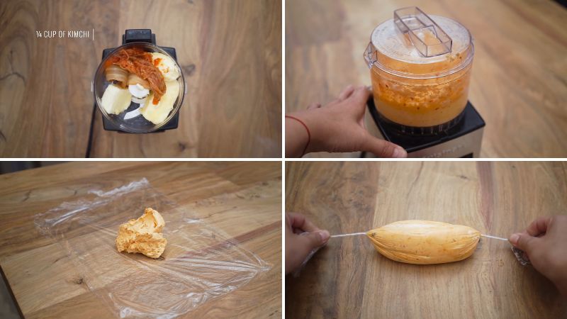 Cách làm bơ kim chi rất đơn giản, bạn hãy cho 1/2 chén bơ, 1/4 chén kim chi vào cối xay. bạn hãy bấm nút và xay cho hỗn hợp nhuyễn mịn.