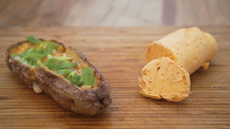 Bạn có thể thưởng thức bơ kim chi với khoai lang nướng. Bạn hãy nướng chín nửa củ khoai lang, khoét bớt phần ruột khoai. Cho bơ kim chi vào, dàn đều và đập thêm một quả trứng gà. Nướng khoảng 10 phút trong 180 độ cho trứng chín.