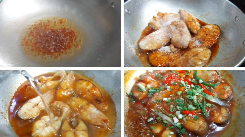 Làm nóng dầu ăn, rồi cho 2 muỗng canh đường vào đun nhỏ lửa. Dùng đũa đảo đều đến khi đường chuyển thành màu vàng cánh gián.