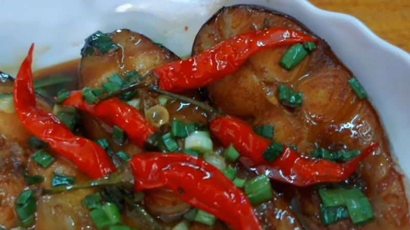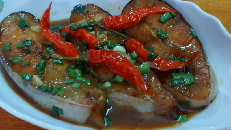 Cá hú kho nước dừa có màu nâu cánh gián bóng mẩy siêu hấp dẫn. Đừng quên ăn món này cùng một chén cơm nóng hổi và ít rau xanh tươi nhé!