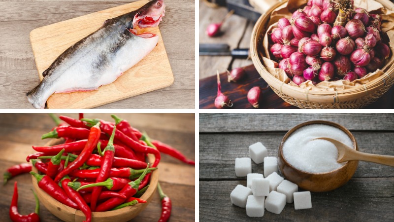 Hành tím và tỏi bóc sạch vỏ, rửa lại bằng nước sạch để loại bỏ bụi bẩn. Ớt bỏ cuống, thái nhỏ cùng với hành tím và tỏi, cho vào tô.
