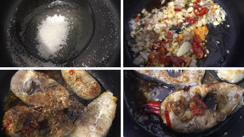 Dùng đũa hoặc thìa khuấy đều cho đến khi đường tan hết và chuyển sang màu cánh gián. Sau khi nước màu đã chuyển màu thì cho hành lá, tỏi, ớt băm nhỏ vào xào thơm thì cho cá vào, đảo nhẹ tay để thịt cá chín đều.