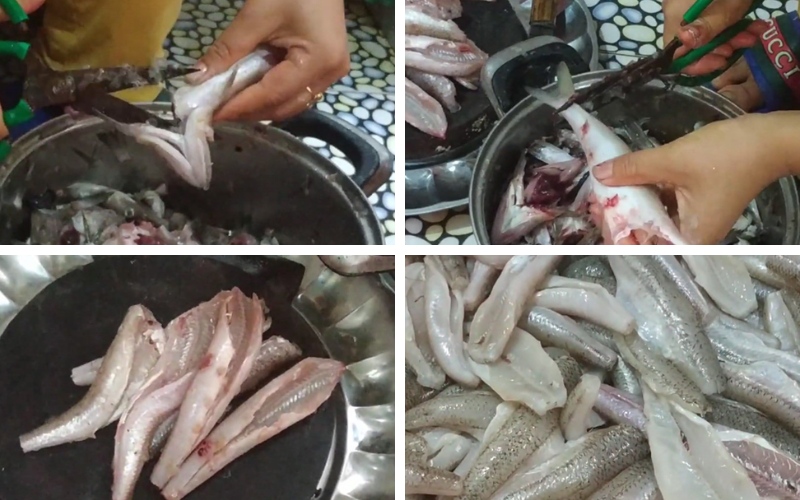 Tiếp đến, bạn dùng dao từ từ lóc bỏ hết phần xương sống của cá, để ráo.