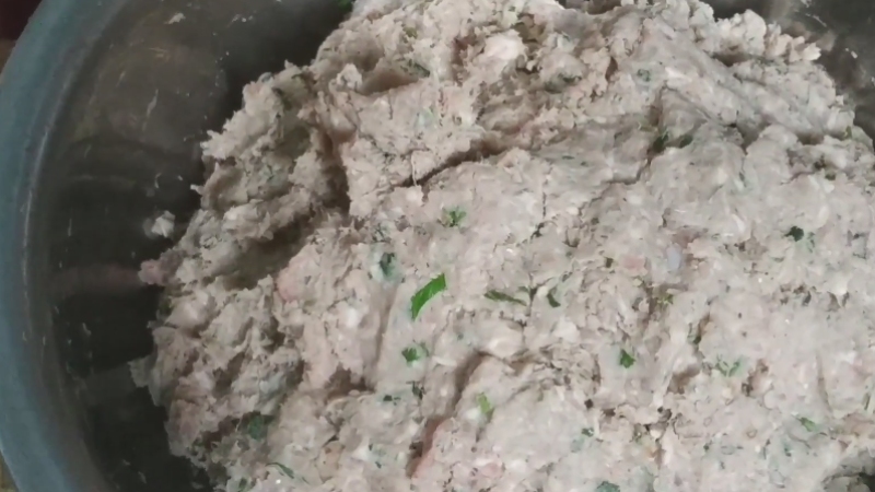Tiếp đến, bạn ướp thịt cá với 2 muỗng canh hành tím băm nhuyễn, 2 muỗng canh hành lá cắt nhuyễn, 1 ít tiêu, muối và hạt nêm rồi dùng tay trộn thật đều để cá thấm đều gia vị.