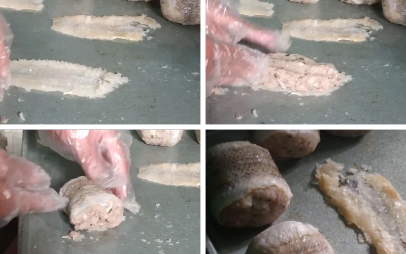 Bạn trải đều 1 miếng thịt cá đã lóc hết xương trên mặt phẳng rồi cho lên trên 1 phần nhân vừa đủ chiều dài miếng cá, bắt đầu cuộn tròn.