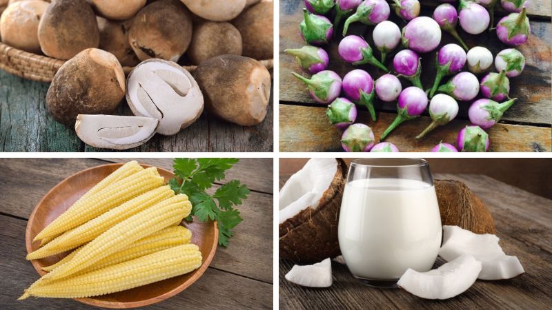 Bạn tiếp tục sử dụng chảo đã chiên lát sườn chay và cho lần lượt nấm rơm bắp non, các loại cà pháo đã ngâm, nước sốt cà ri xanh, 1 muỗng canh hạt nêm chay, 1/2 muỗng cà phê muối, 2 muỗng canh đường, 1 muỗng cà phê tiêu sọ và nấu tất cả các nguyên liệu trong vòng 3 phút.