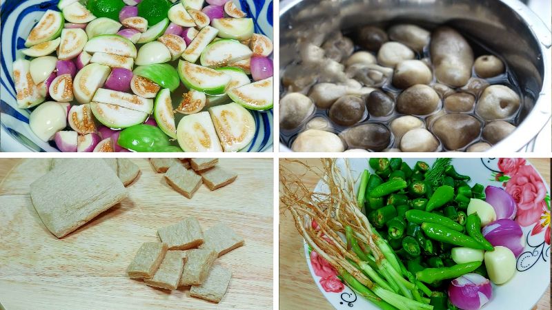 • Ớt sừng đỏ không cay, lát sườn chay, ớt xanh, thì là, lá chanh, húng quế, tỏi, hành tím, sả xay, ngò rí