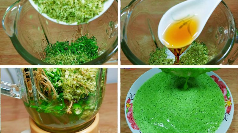 Bạn chuẩn bị một cái máy xay sinh tố và cho vào lần lượt 50g ớt xanh, rễ ngò rí, 30g hành tím và tỏi, 30g thì là, 50g sả xay, 1 muỗng cà phê muối, 1 muỗng canh nước mắm chay, 150ml nước và nhấn cho máy xay thật mịn hỗn hợp. Phần lá ngò rí bạn sẽ xay riêng với 150ml nước để dùng sau.