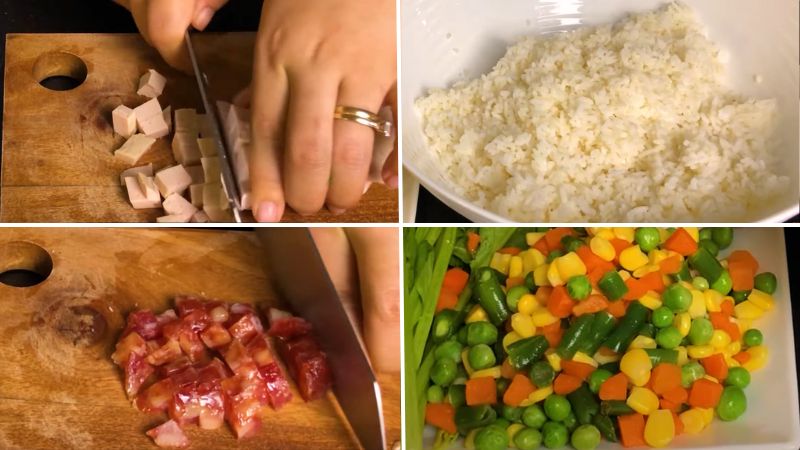 Bạn chuẩn bị 4 chén cơm nguội, nên chọn cơm nguội để khi chiên hạt được dẻo và tơi, ăn ngon hơn. Rau củ hỗn hợp bạn mang đi rửa sạch rồi để ráo. Lạp xưởng và chả lụa cắt hạt lựu. Tỏi lột sạch vỏ và băm nhuyễn. Hành lá bạn rửa sạch, cắt nhuyễn vừa ăn.
