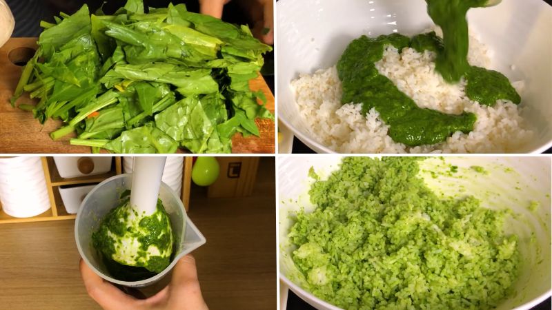 Cải bó xôi bạn rửa sạch và cắt khúc rồi cho vào máy xay xay nhuyễn, lấy nước cải cho vào phần cơm, trộn thật đều. Ướp vào cơm 1 muỗng cà phê muối, 2 muỗng cà phê đường rồi tiếp tục trộn để gia vị được thấm đều.