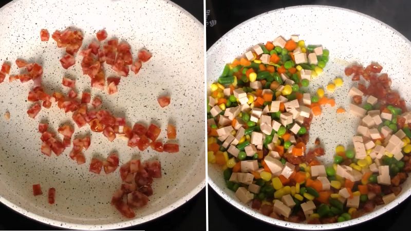 Chuẩn bị chảo, cho lạp xưởng vào chảo và xào đến khi chín trong, vàng đều thì cho tiếp rau củ hỗn hợp và chả lụa đã cắt vào cùng, đảo đều tay để hỗn hợp chín đều. Nêm vào hỗn hợp 1.5 muỗng cà phê hạt nêm, ½ muỗng cà phê đường rồi tiếp tục đảo nhanh tay khi thấy nguyên liệu chín thì cho ra tô.