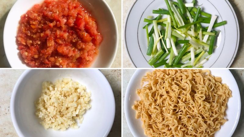 Cà chua rửa sạch, để ráo. Phần cuống cắt bỏ rồi băm nhuyễn và cho vào tô. Tỏi bóc vỏ, băm nhuyễn. Hành lá và rau mùi rửa sạch, cắt thành khúc nhỏ khoảng 1 lóng tay. Mì trụng nước sôi khoảng 30 giây rồi vớt ra, để ráo nước.