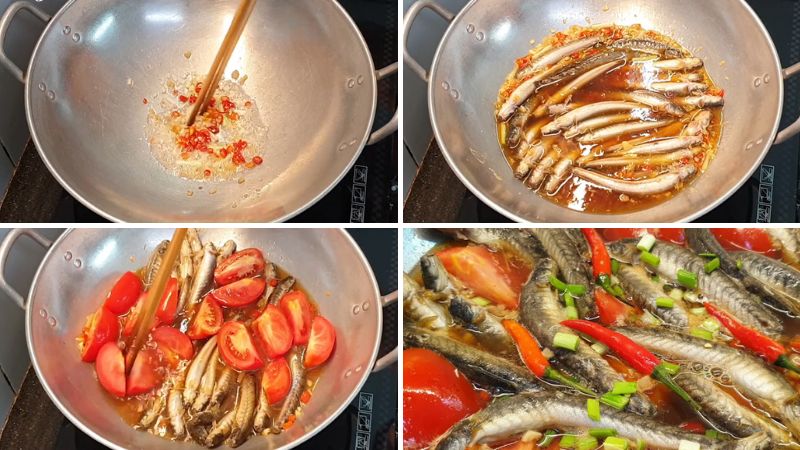 Bạn hãy bắc chảo lên bếp, cho vào chảo 1 muỗng canh dầu ăn. Khi dầu nóng, bạn cho đầu hành, tỏi vào phi thơm, kế đến cho ớt băm vào chung.