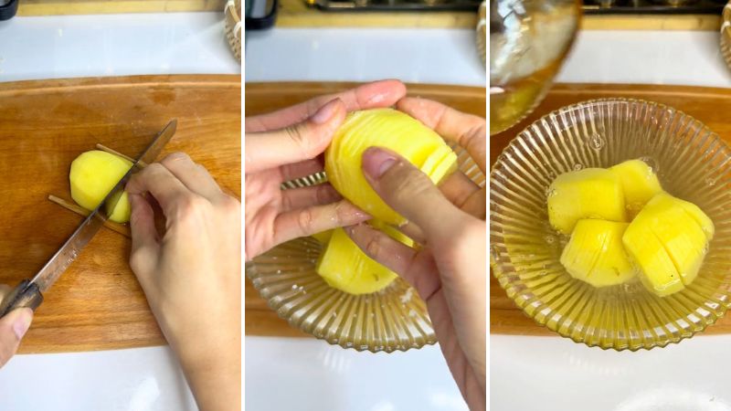 Khoai tây mua về bạn hãy rửa sạch với nước, gọt bỏ vỏ khoai tây. Kế đến, bạn cắt đôi củ khoai ra, dùng 2 chiếc đũa cố đỉnh nửa miếng khoai. Cắt dọc củ khoai thành từng lát mỏng. Đũa sẽ là bệ đỡ bên dưới để những miếng khoai vẫn còn dính lại với nhau.