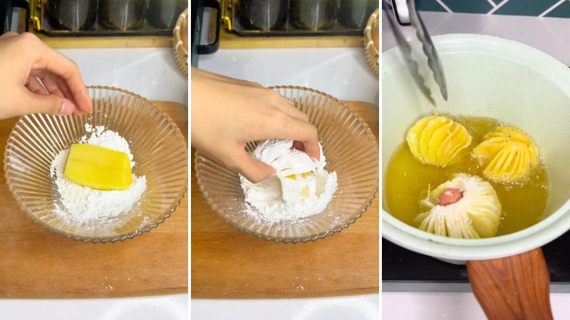 Bạn hãy phủ đều khoai bằng bột chiên giòn, đặc biệt bạn hãy phủ đều bột vào các lớp khoai tây để khoai sẽ được giòn hơn khi chiên. Dùng tăm cố định hai đầu miếng khoai lại để tạo hình lồng đèn. Cho khoai vào chiên ngập dầu đến khi vàng giòn thì vớt ra.