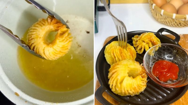Khoai tây chiên theo cách này có vẻ ngoài như một chiếc đèn lồng ngày Trung thu. Khoai có màu vàng ươm bắt mắt cùng hương thơm quyến rũ. Bạn hãy chấm khoai với tương ớt, vị béo bùi của khoai kết hợp với vị mặn mặn cay cay của tương ớt rất hấp dẫn. Bạn phải thử ngay nhé!