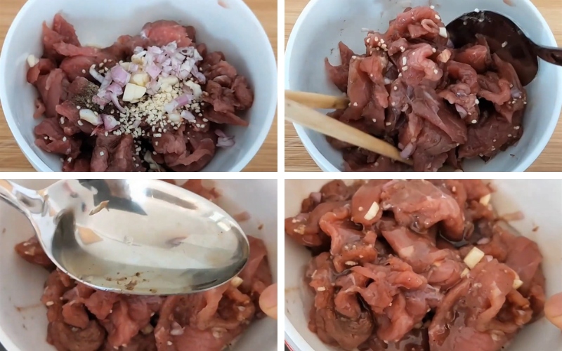 Bạn ướp thịt bò với 1 muỗng canh nước tương, 1 muỗng cà phê hạt nêm, 1/2 muỗng cà phê tiêu xay, 1/2 muỗng canh hành tỏi băm, 1 muỗng canh dầu ăn vào, trộn đều và để trong khoảng 15 – 20 phút cho thịt thấm gia vị.