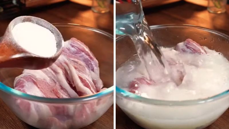 Cho 1 thìa bột mì vào nọng heo, đổ đầy nước ấm vào để rửa sạch thịt.