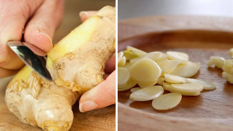 Gừng rửa sạch, cạo vỏ rồi cắt lát. Tỏi lột vỏ, rửa sạch sau đó cắt lát.