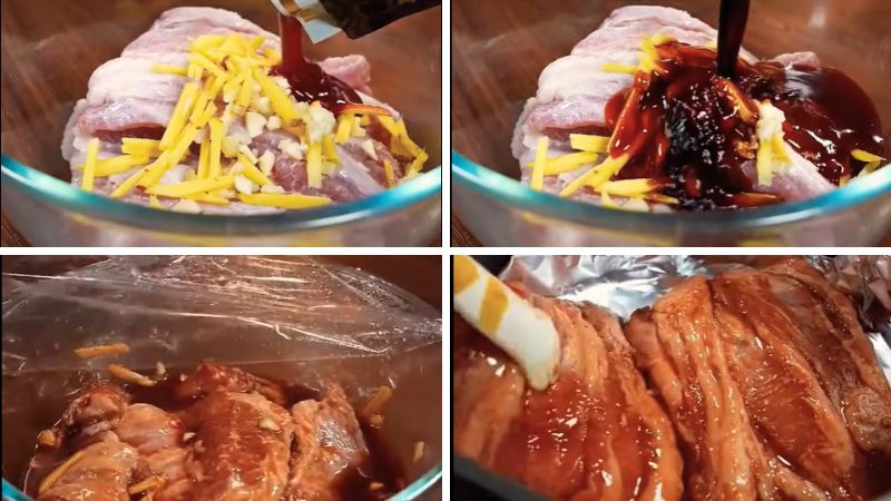 Cho gừng, tỏi, 1 gói sốt xá xíu, 1 thìa nước tương, nửa thìa dầu hào, nửa chén rượu gạo, 1 thìa mật ong vào trộn đều với nọng thịt. Sau đó ướp trong tủ lạnh ít nhất 1 giờ và tốt nhất là ướp qua đêm.
