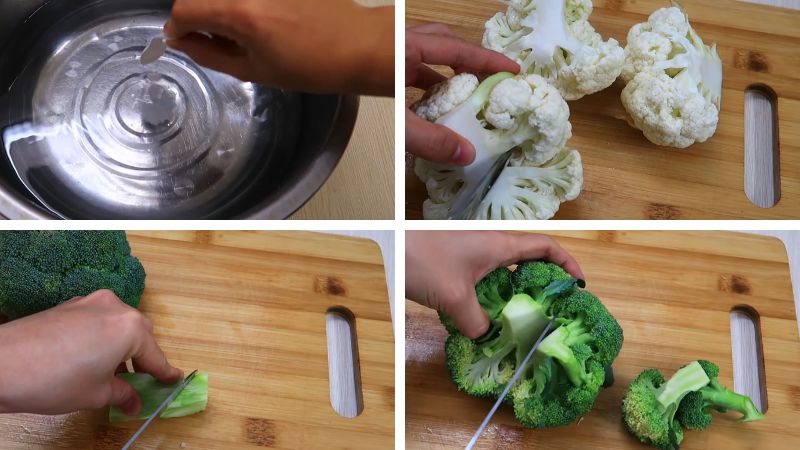 Chuẩn bị nửa thau nước sạch, hòa tan với muối. Tách bông cải trắng thành từng miếng nhỏ, tương tự với súp lơ xanh, thân bông cải xanh tước vỏ thái nhỏ. Sau đó, ngâm bông cải trong nước muối pha loãng trong vòng 15 phút. Với củ cà rốt, rửa sạch thái hoa.