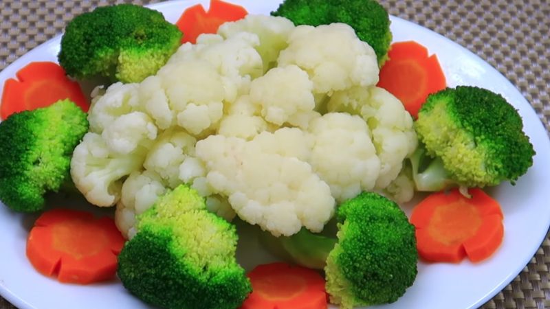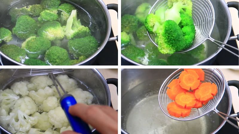 Luộc bông cải xanh trong nước thật sôi trong vòng 2 phút, vớt ra. Đợi nước sôi trở lại, luộc bông cải trắng trong vòng 4 phút với lửa thật lớn sau đó vớt ra. Luộc sơ cà rốt qua nước sôi trong vòng 2 phút. Sử dụng 1 ít nước luộc từ rau, củ làm nước sốt.
