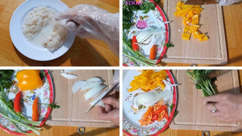 Ớt chuông bạn rửa sạch, bỏ hạt và cắt thành từng lát mỏng tương tự hành tây.