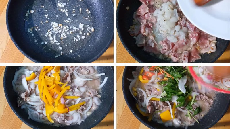 Tiếp tục bạn cho hành tây vào vào xào 2 – 3 phút, tiếp tục bỏ ớt chuông vào xào 4 phút đảo đều. Cuối cùng bạn cho cần tây và ớt trái vào xào chung.
