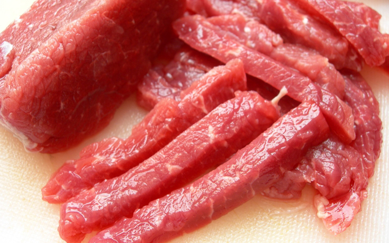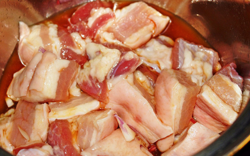 Thịt heo mua về rửa sạch, thái miếng vừa ăn, không quá dày cũng không quá mỏng.