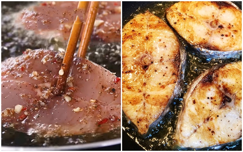 Bạn bắc chảo lên bếp đợi chảo nóng thì cho dầu ăn vào đun sôi tiếp theo cho cá thu đã ướp vào chiên vàng đều 2 mặt thì vớt cá ra đĩa.