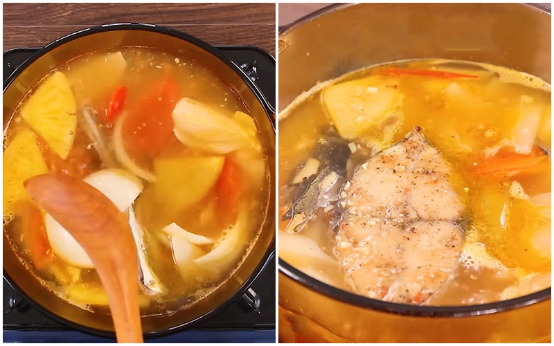 Nấu nước dùng trong khoảng 20 phút thì bạn tiến hành nêm nếm gia vị gồm: 1 muỗng cà phê nước mắm, 1 muỗng cà phê hạt nêm, 1 muỗng cà phê đường. Sau đó bỏ phần cá thu đã chiên vào nấu thêm khoảng 3 phút thì tắt bếp.