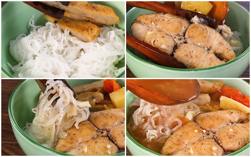 Bạn bỏ bún ra tô, sau đó xếp lên vài miếng chả cá, bỏ sứa, cá thu vào, cuối cùng chan nước dùng lên và thưởng thức.