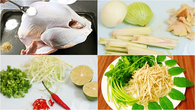Gà sau khi mua về, các bạn xát muối, rửa sạch. Hành tây cắt đôi, xả cắt khúc, gừng đập dập. Hành, ớt, chanh rửa sạch, thái nhỏ. Giá đỗ, ngò rửa sạch.