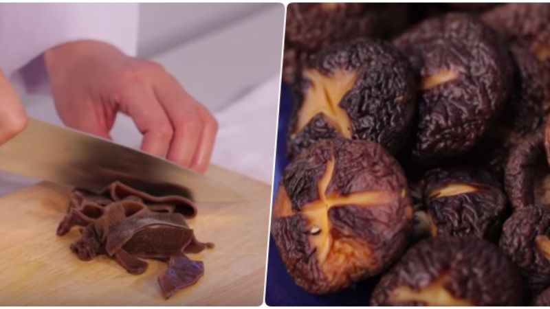 Bạn ngâm nấm hương và mộc nhĩ với nước ấm trong khoảng 30 phút cho nở rồi rửa sạch. Mộc nhĩ thì thái sợi, nấm hương thì bỏ chân và xẻ hình chữ thập lên mặt cho đẹp. Lưu ý đừng thái sợi quá nhỏ nấm sẽ vụn mất đi độ giòn ngon.