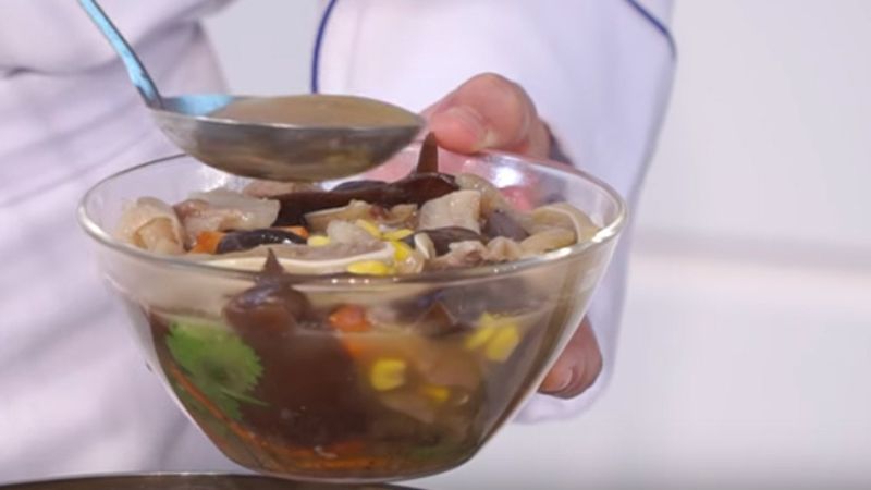 Sau khi thịt được ninh nhừ, chín mềm, bạn cho nấm và mộc nhĩ, cà rốt cắt nhỏ và bắp vào nồi đun thêm cho đến khi lượng nước rút còn khoảng 2/3 lúc đầu. Nêm nếm lại cho vừa ăn rồi tắt bếp.