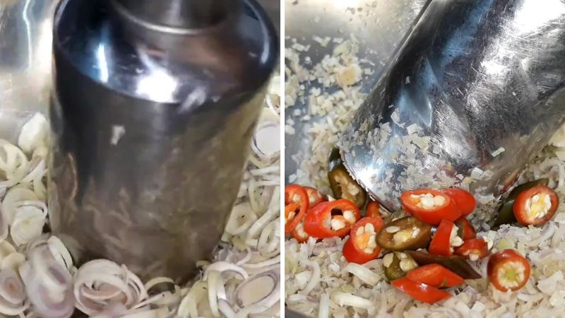 Sả cắt bỏ gốc, loại bỏ lớp già, rửa sạch, băm nhỏ hoặc giã nhuyễn. Ớt rửa sạch (có thể bỏ hạt nếu muốn), bỏ cuống, cắt nhỏ và băm cùng với sả cho nhuyễn.