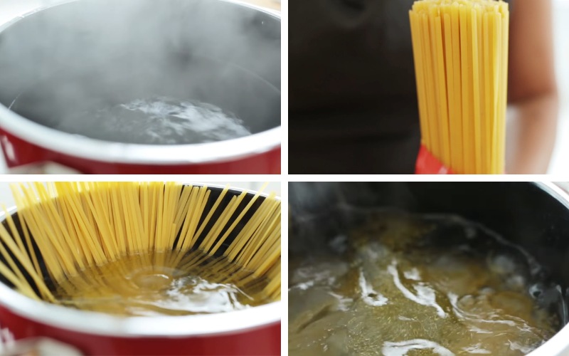 Đun sôi 1 nồi nước, cho 1 muỗng canh muối, 1 muỗng canh dầu ăn vào, khuấy đều. Tiếp theo cho mì vào nấu khoảng 10 phút cho mì chín thì vớt ra để riêng.