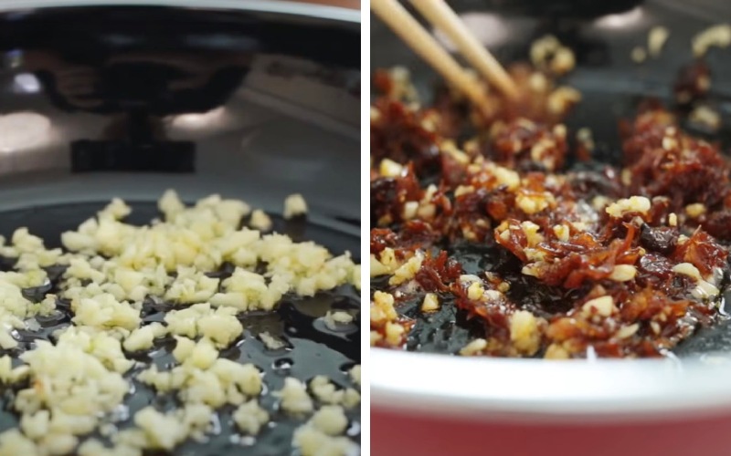 Đun nóng 1 muỗng canh dầu ăn, phi thơm 2 muỗng canh tỏi băm rồi cho 50g xốt XO vào phi thơm khoảng 1 phút.