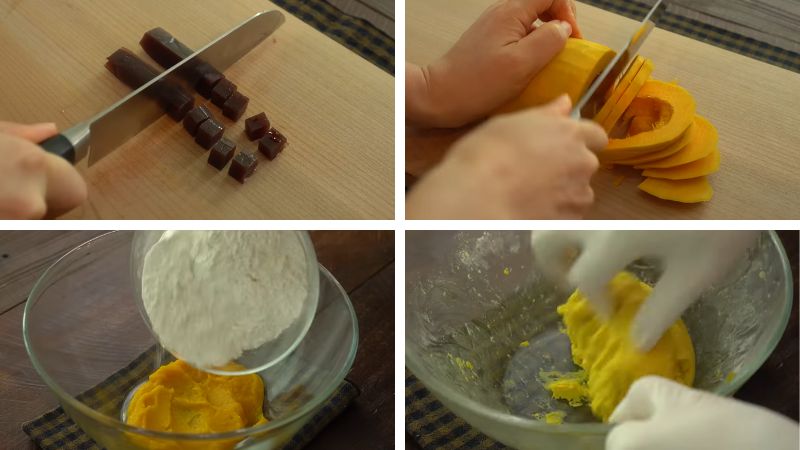 Trong lúc bí ngô còn nóng, nghiền hoặc bào cho đến khi nó trở nên mềm mịn thì cho 200g bột nếp, 10g đường 1 ít muối vào và trộn đều.