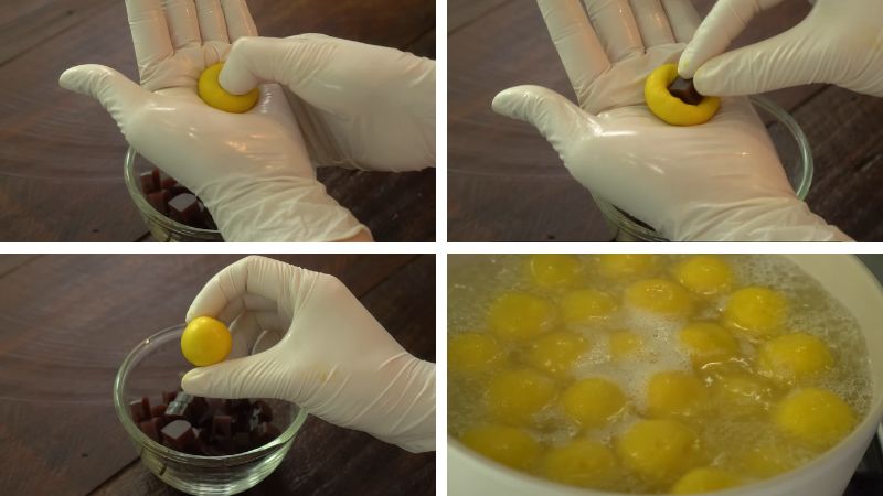 Sau khi đã trộn bột bánh, nặn bột bánh thành những hình tròn nhỏ. Sau đó, tạo lỗ tròn và cho thạch đậu đỏ vào bên trong rồi tiếp tục viên thành hình tròn. Cho số bánh đã tạo hình vào một nồi nước sôi và đun trong vòng 5 phút. Khi những chiếc bánh gạo đã chín, nó sẽ nổi lên trên.