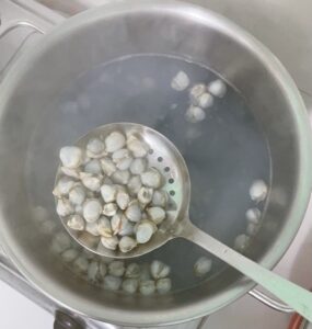 Hến luộc sơ – Chuẩn bị cho món xào. Nguồn: Du lịch Vĩnh Long