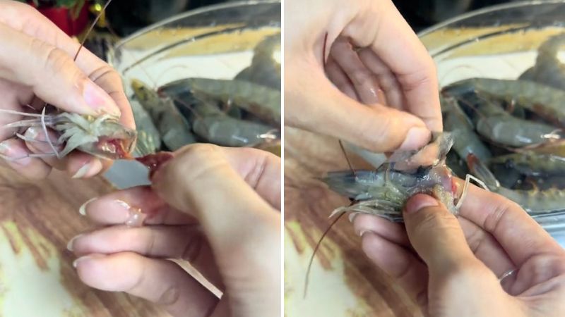 Khi bạn đã tách đầu tôm ra, bạn hãy loại bỏ túi chất thải trên đầu tôm, rửa sơ lại với nước. Kế đó, bạn lột bỏ luôn phần vỏ cứng trên đầu tôm.