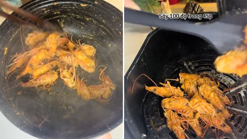 Bạn hãy cho đầu tôm vào chảo chống dính. Rang trên lửa vừa cho đầu tôm chín và hơi săn lại. Kế đến, bạn cho đầu tôm đã rang vào nồi chiên không dầu và nướng 45 phút với 100 độ C. Sao cho đầu tôm thật giòn, khô là được nhé!