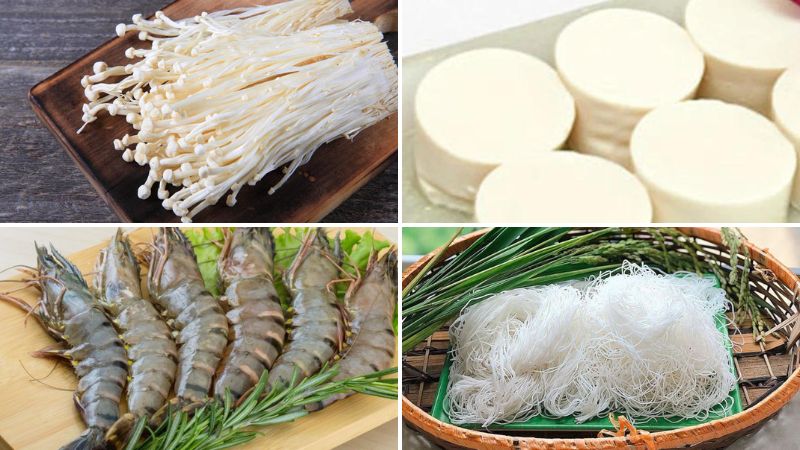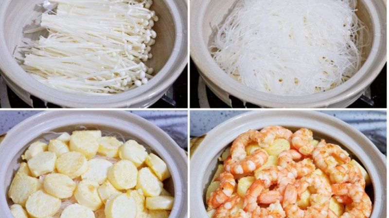 Tôm mua về bóc vỏ, bỏ chỉ lưng, rửa sạch với muối, rượu nấu ăn, để ráo. Đậu hũ non cắt khoanh dày. Miến ngâm nở. Nấm kim châm bỏ gốc, rửa sạch, để ráo. Hành lá rửa sạch, thái nhỏ.