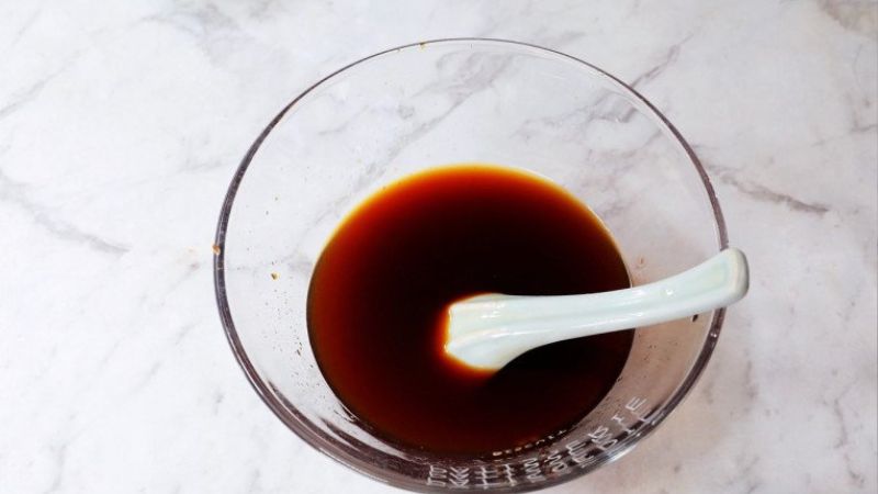 Bạn hãy cho vào chén 2 muỗng canh sốt cà chua, 1 muỗng canh dầu hào, 1 muỗng canh nước tương, 1 muỗng canh hắc xì dầu, đường và nửa chén nước, khuấy đều cho gia vị tan hết.