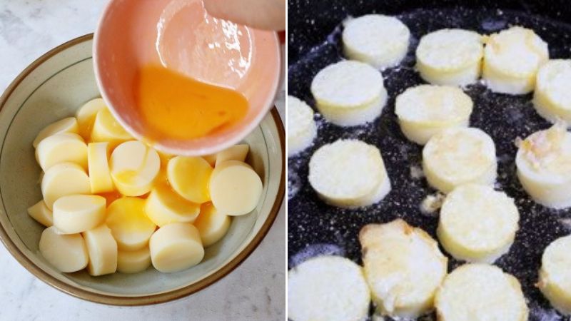 Cho đậu hũ cắt khoanh ra tô, cho 1 quả trứng đánh tan vào, trộn đều cho trứng bám vào đậu hũ. Chiên đậu hũ cho vàng đều hai mặt rồi gắp ra.